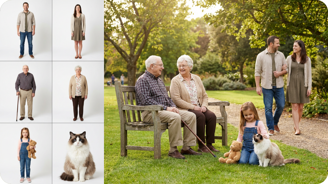 Blend up to fourteen images in a single prompt; Nano Banana Pro balances composition, color harmony, and perspective while maintaining the unique identity of each asset.